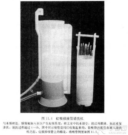 6. 用自來水通過清洗器的虹吸作用清洗移液管,**少 4 h,也可用帶有移液接頭的自動清洗機來清洗,但不要加清潔劑。