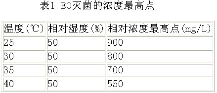3 環(huán)氧乙烷的控制參數(shù) EO滅菌過程關(guān)鍵參數(shù)的控制是達(dá)到滅菌質(zhì)量的保證其滅菌的關(guān)鍵參數(shù)為EO的濃度、滅菌時(shí)腔體內(nèi)的濕度、溫度和時(shí)間。這些關(guān)鍵因素直接影響滅菌的效果;每個(gè)關(guān)鍵因素在程度上可有所不同,但相互之間必須達(dá)到平衡。